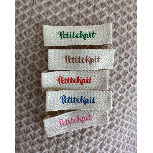 Tekstillabel med teksten "PetiteKnit" i pakker á 5 stk.
